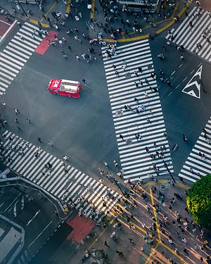 An image overlooking the iconic Shibuya scramble near sunset. This intersection is one of the busiest in the world. Enjoy the view without the crowds, with this print.