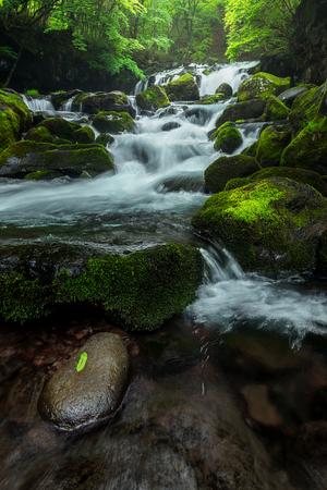 A focused stacked image of a tranquil waterfall in the mountains of Chino, located in Nagano, Japan.